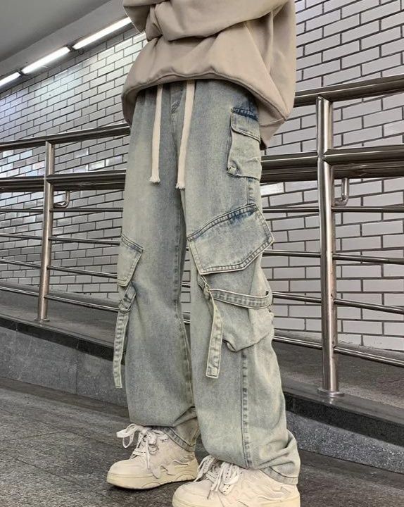 ゆったりとしたシルエットが特徴的なデニムカーゴパンツ。大きなポケットとストラップがアクセントに。裾広がりのデザインで、ストリートファッションやカジュアルスタイルにぴったり。快適な着心地と個性的な雰囲気を両立した一本。